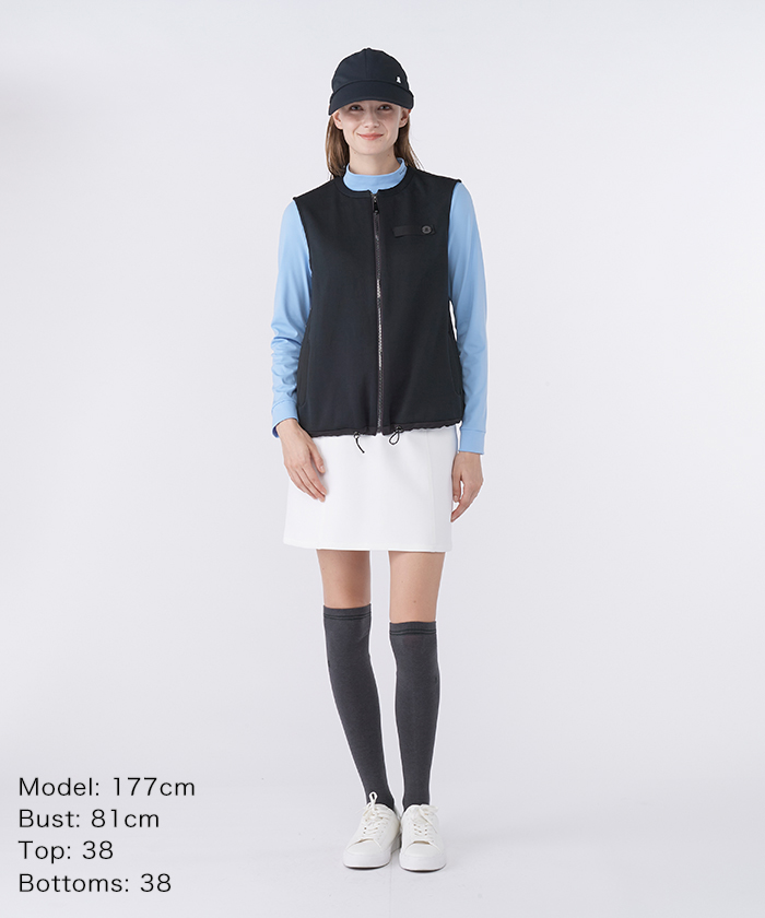 トップスは、丸みのあるシルエットが特徴のノーカラー前開きカットソーベストです。