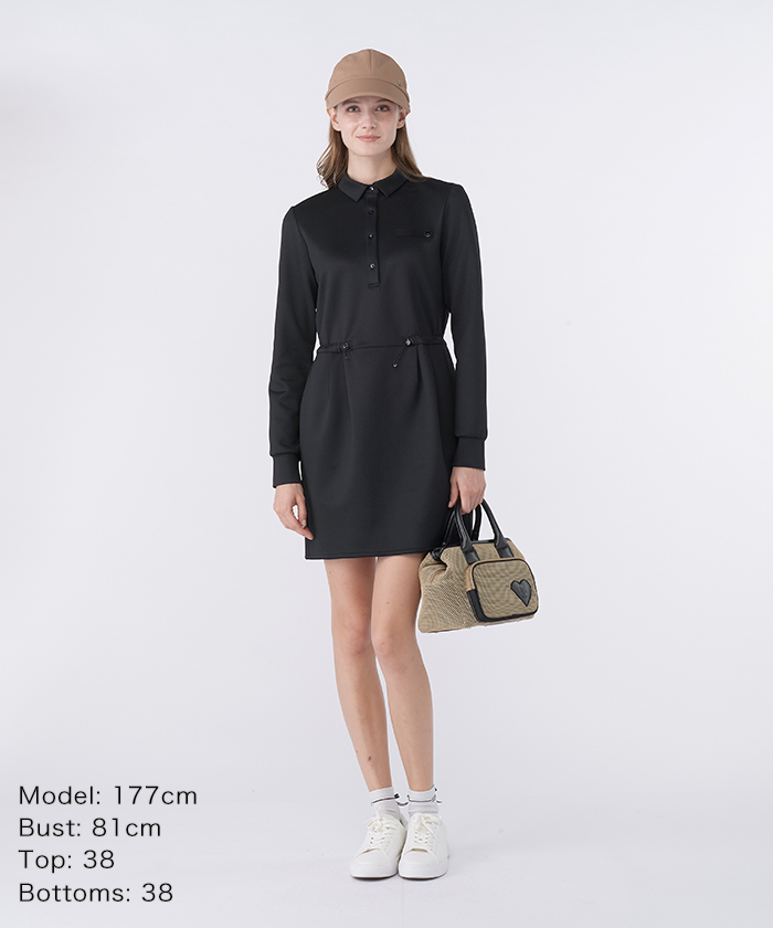 トップスは、フロント金属釦開きのスタンドカラー長袖ワンピースです。