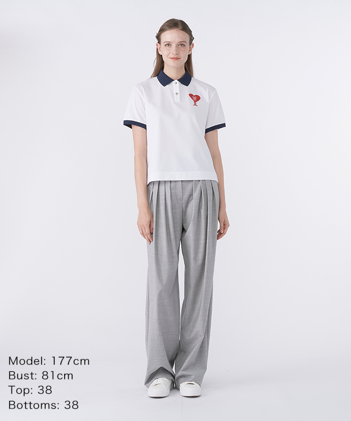 トップスは、ハートのモチーフをアクセントにした、可愛らしさと上品さを兼ね備えたポロシャツです。
