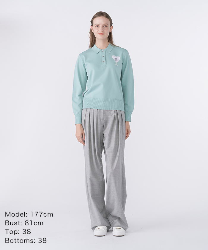 トップスは、左胸にシーズンモチーフのハートロゴを配した、可愛らしい印象のポロ衿セーターです。