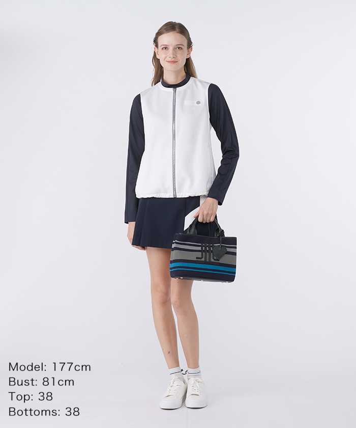 トップスは、丸みのあるシルエットが特徴のノーカラー前開きカットソーベストです。