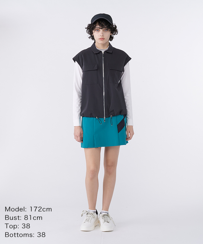 トップスは、丸みのあるオーバーシルエットが特徴的な、トレンド感のあるアウターベストです。