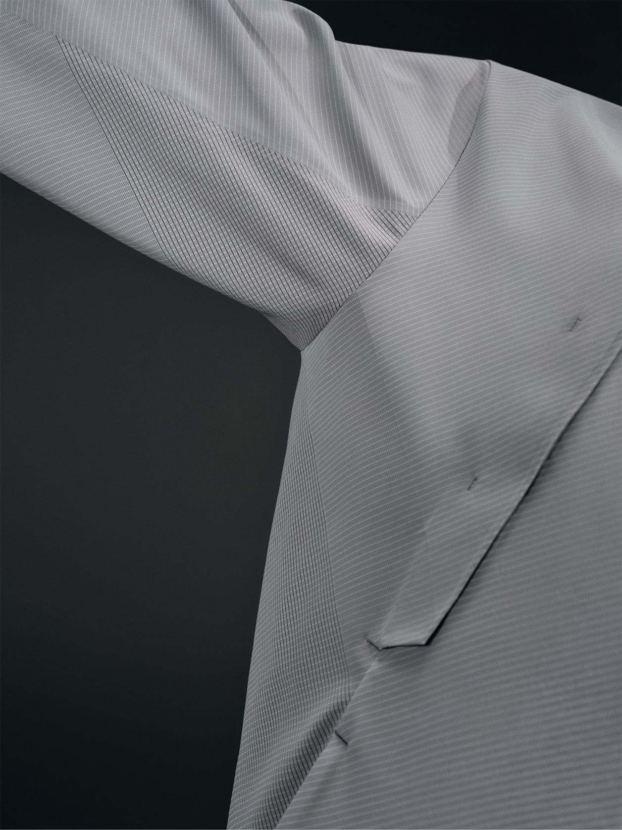 発汗量が特に多い胸や背中、脇を中心に、通気メッシュを配置。一枚の生地の中で、遮熱と通気を段階的に切り替える設計。
