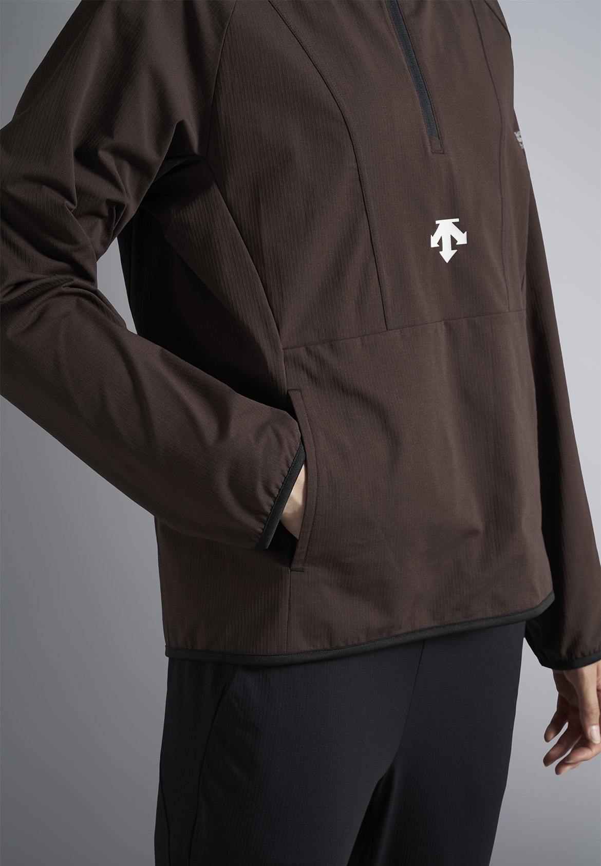 腕の振り上げ動作を妨げない脇パネル構造や、着脱・体温調節がしやすい胸元ファスナーなど、プレー中の動きやすさを追求。トップスの腹部、パンツの両サイドには大きめのポケットを配置し、移動時にも便利な収納力を確保。