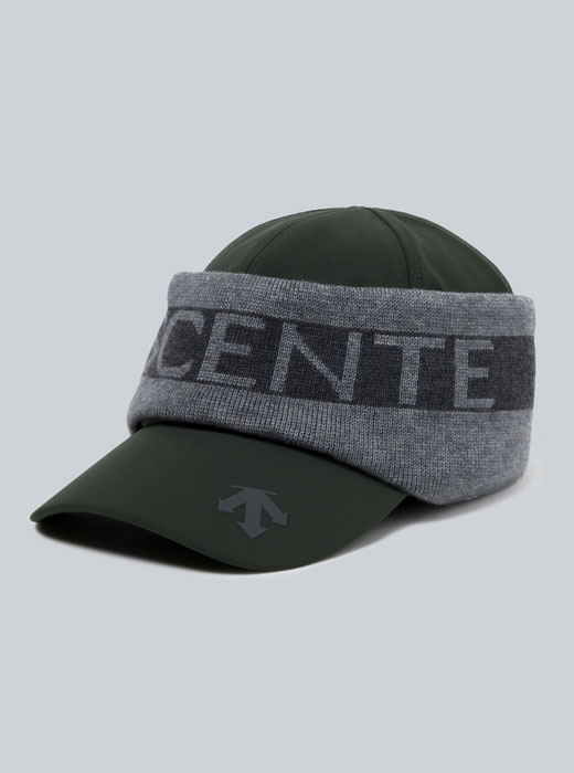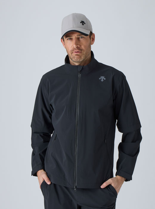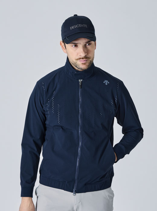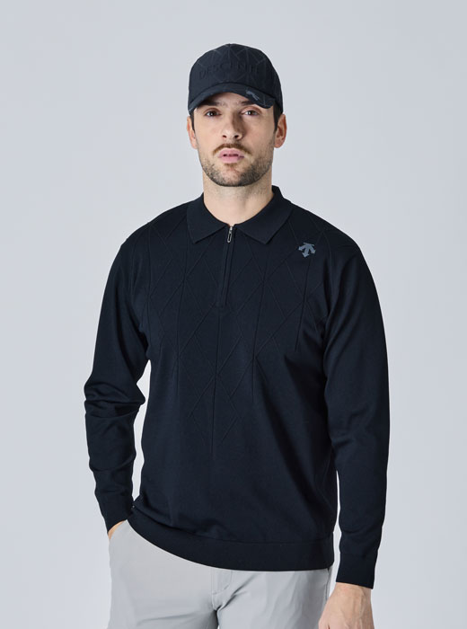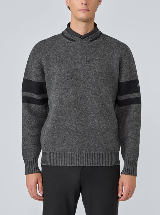 「DS(DESCENTE略称)」ロゴのモノグラム柄をジャカードで表現したフルジップセーター。