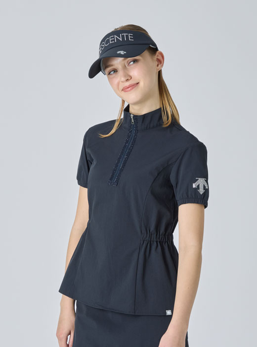 ストレッチナイロンを使ったジャージージャケット。少し高めの衿仕様、シルエットを意識したダーツや脇切替などスタイルにもこだわったアイテム。