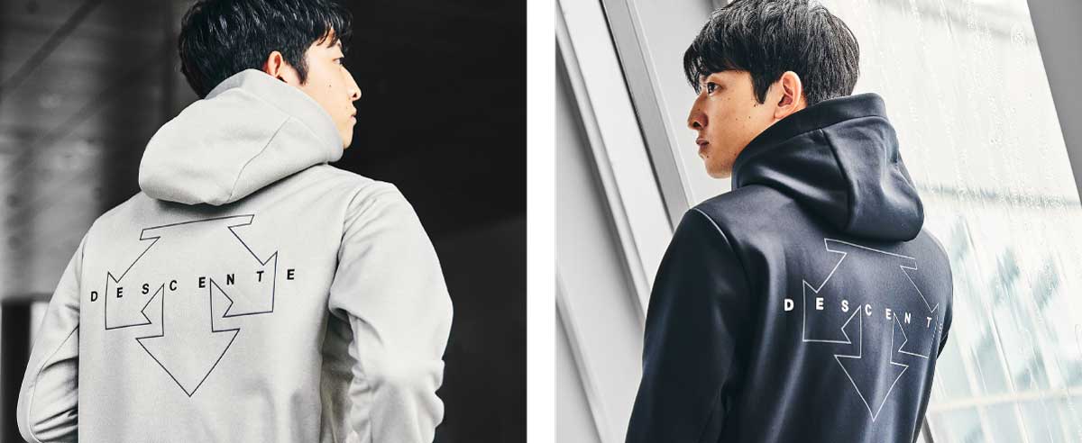 デサントが誇る防寒機能を持ち、大胆なロゴ使いが特徴で
