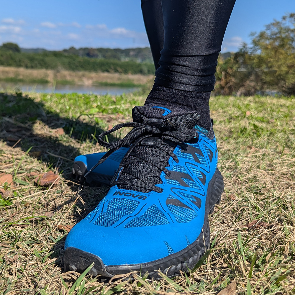 TRAILTALONの空に映えるスカイブルーのカラーリングがとても気に入りました。足入れをしてみたところ、アッパーもしっかりしていて、靴に守られている感を感じます。
