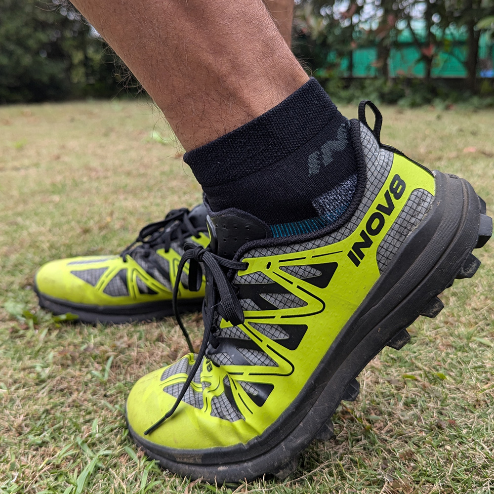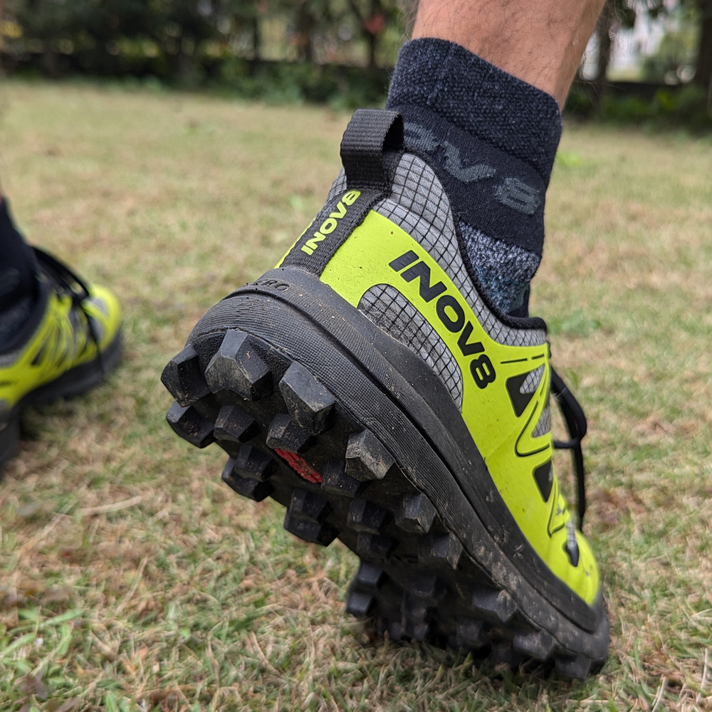 アウトソールはラグが深いこともあり、地面をしっかり掴み、力を十分発揮できている。見た目の印象としては、ぬかるみのある泥向きだと感じられるが、落ち葉の多いトレイル等においても力を発揮すると思われる。
