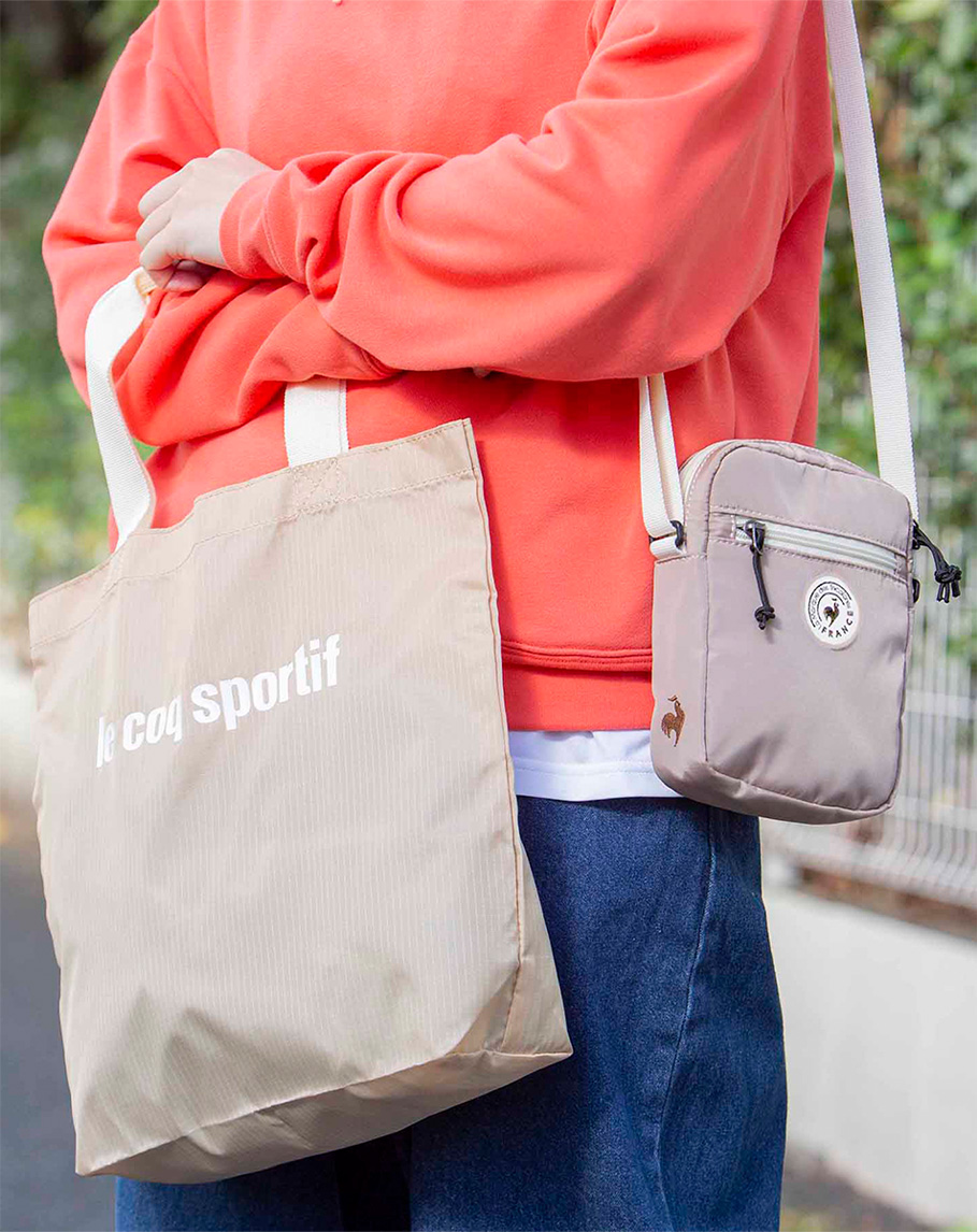 本体はダブルファスナーで開閉がしやすく、外ポケットもファスナー付きで安心。背面にはさっと取り出せるオープンポケットがあり、付属のコンパクトトートバッグが収納されたバッグインバッグ。コンパクトトートバッグはマチ付きで使いやすく、A4ファイルが横向きに収納できる便利なサイズ感で、汎用性の高いバッグ。