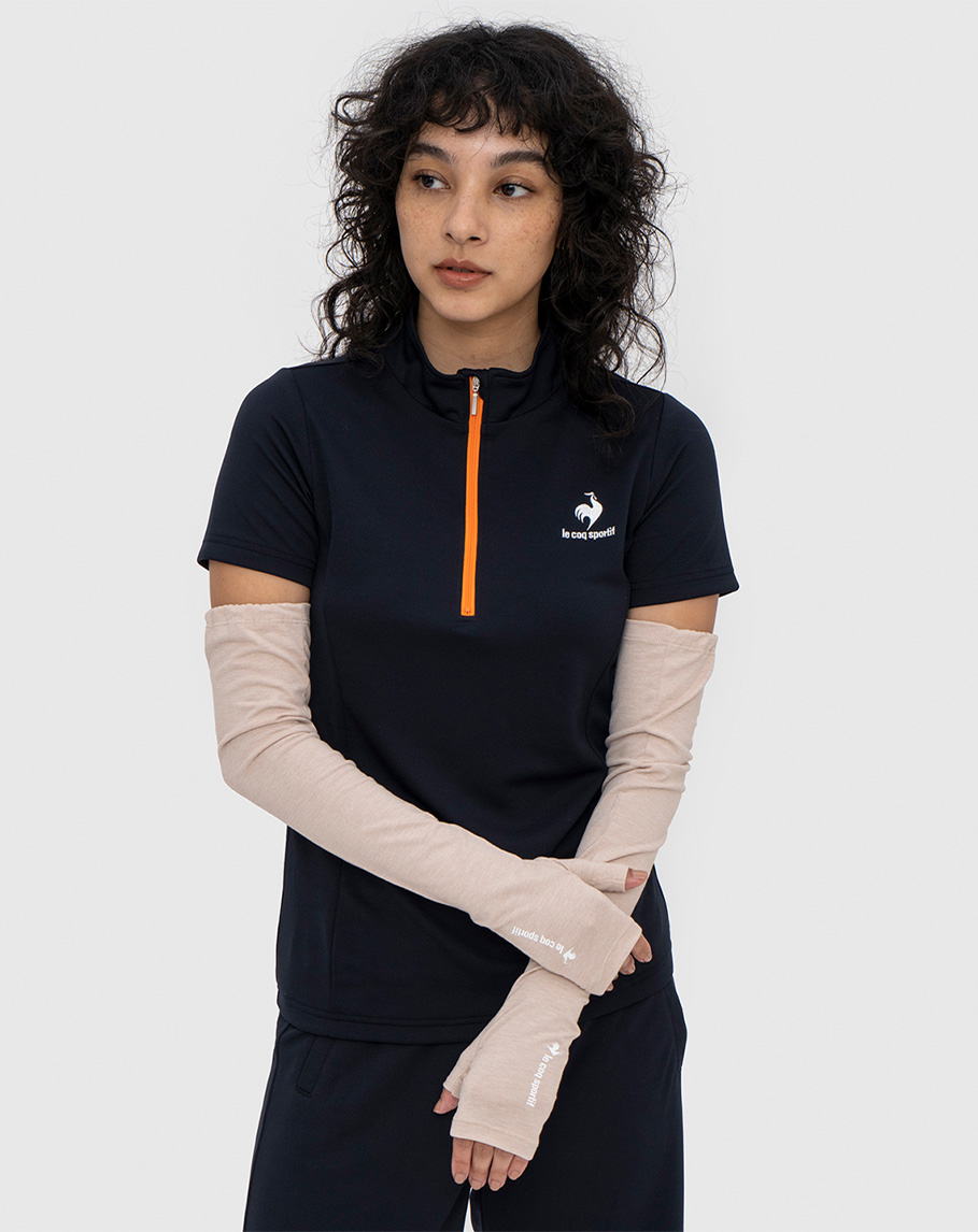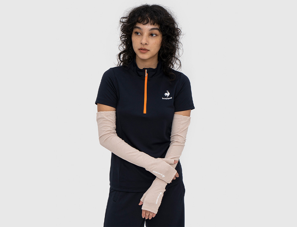 手のひらがオープンになったハンドカバー。指の第一関節まで覆える長さと、吸汗速乾機能とUPF50+機能付で、ドライな着用感と手のひらの日焼けをカバーしてくれる。ルコックスポルティフのデザインロゴをプリントした、シンプルでありながらも上品さを感じるデザインのハンドカバー。