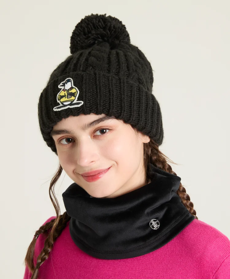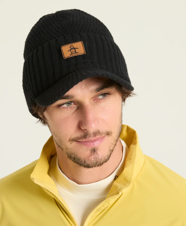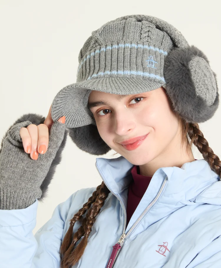 冬場に活躍するつば付きニットキャップ。上品な編み柄とスエード素材のペンギンワッペンがデザインポイント。