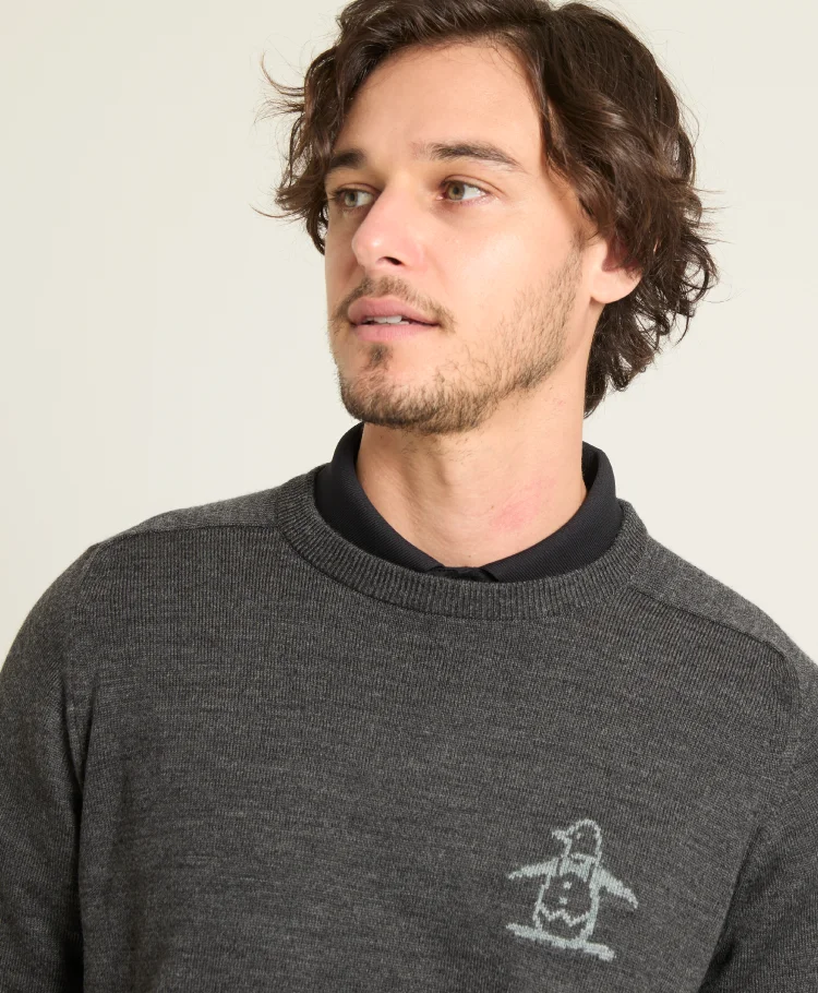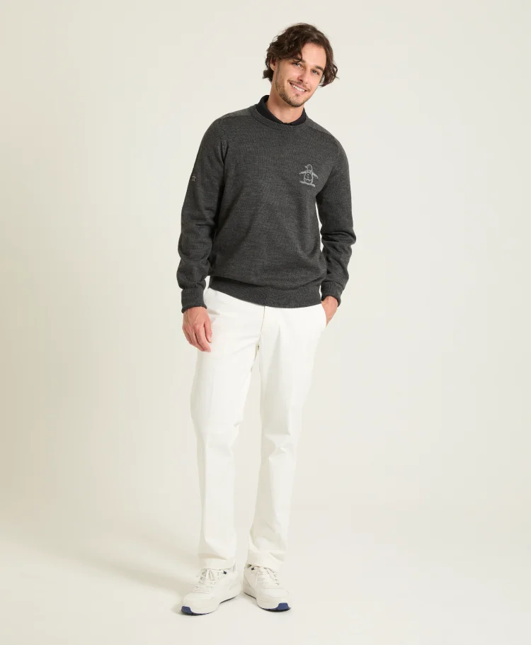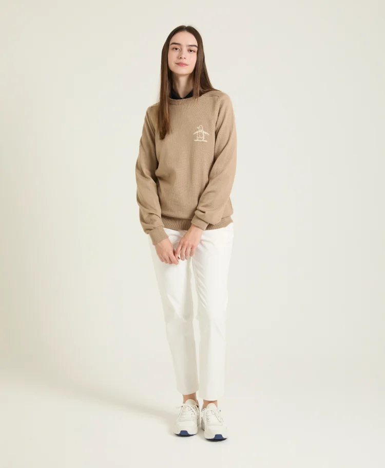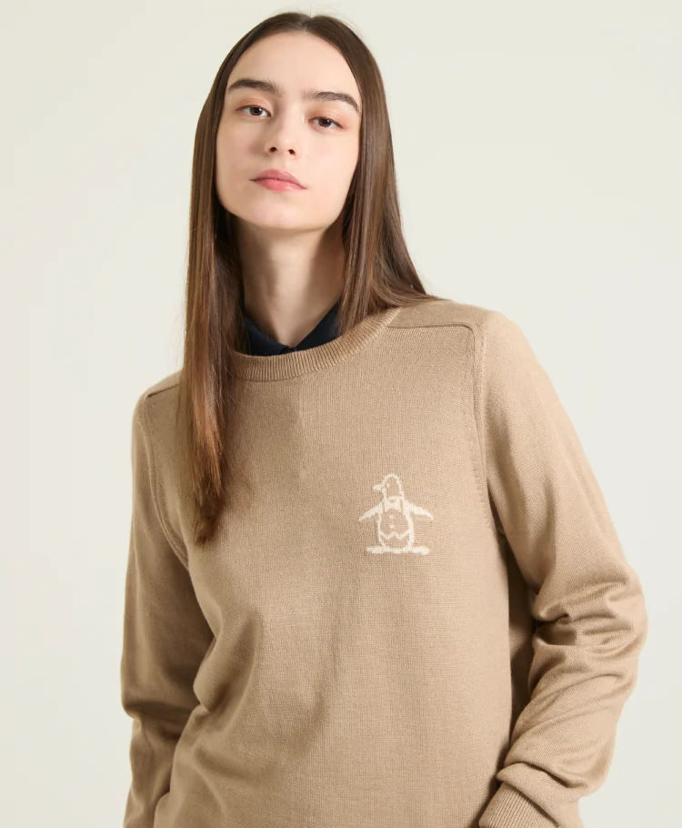 シンプルなデザインのセーターに、インターシャで表現されたビッグロゴがアクセント。ベーシックなデザインで、着回し力抜群です。