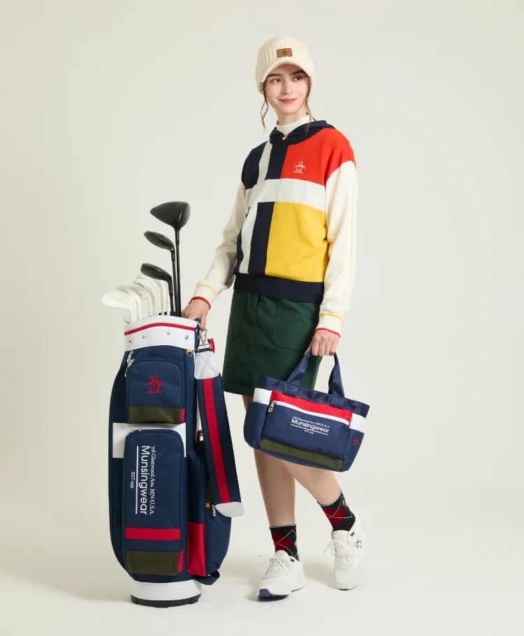 マルチカラーの配色が目を引く個性的なキャディバッグ。上下に分かれたサイドポケットで、小物をすっきり収納できます。