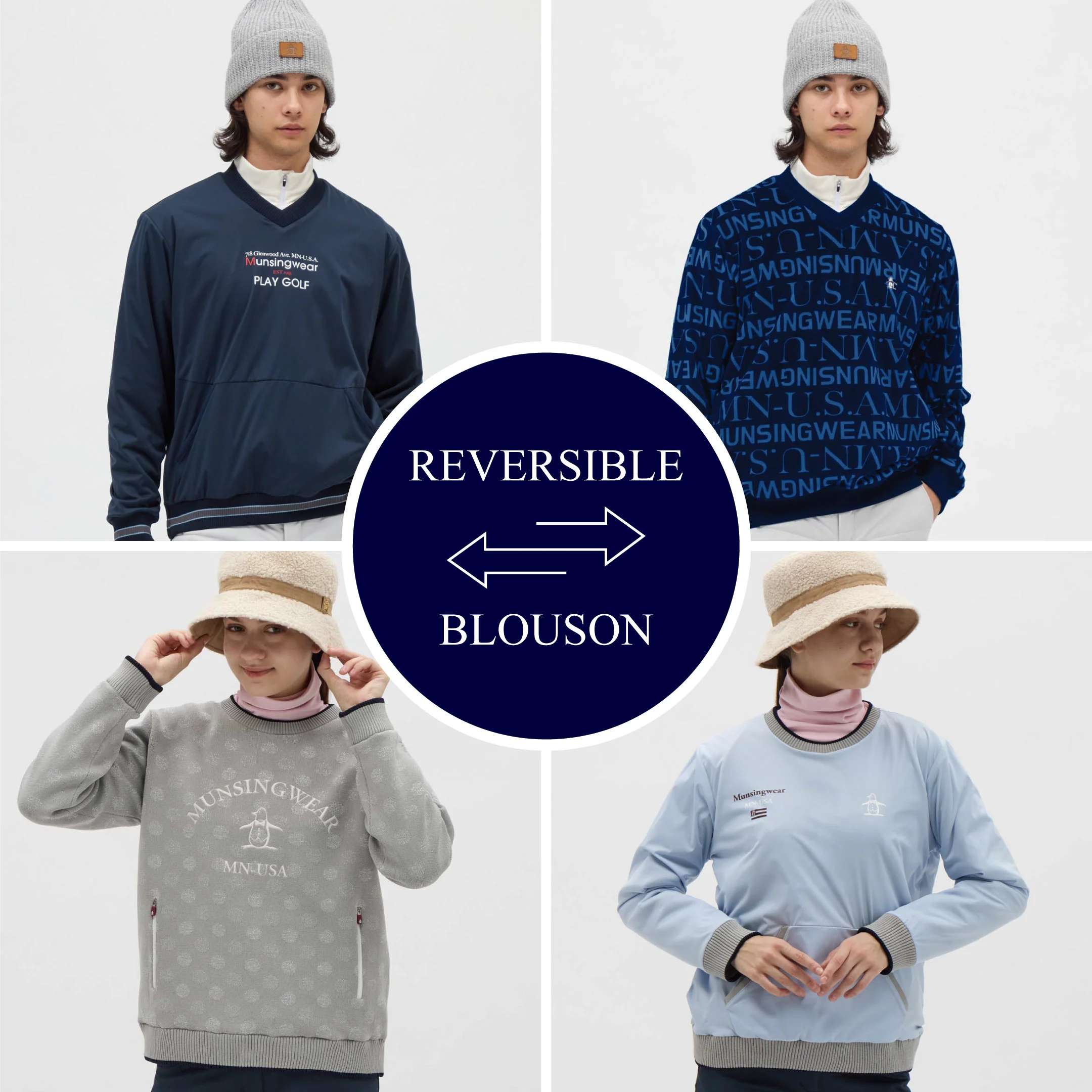両面ニットのリバーシブル ブルゾン。ドット柄の面は柔らかな風合いがあり、プリントが施されている面にははっ水加工が施されています。気候やコーディネートに合わせて2つの質感を着回せます。両面にポケットが付いているため、どちらで着ても便利に使えるデザインです。