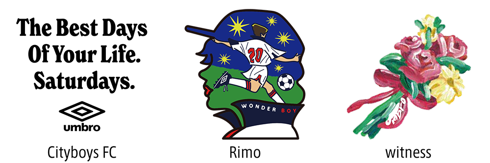 店内で『アンブロ』対象商品を購入された方に、3名のデザイナーによる今回のイベントでしか手に入らない書き下ろしのイラストを、ウェアとシューズにプリント(※シューズはステッカー貼付)できるカスタマイズサービスを実施します。プリントやステッカーのデザインは、フットボールカルチャーを起点に活動する「Cityboys FC」、幅広い分野で活躍するグラフィックアーティスト「Rimo」、フラワーモチーフを手がける「witness」のイベント限定書き下ろしです。対象商品にはジュニアサイズも含まれるので、子どもが自分でデザインしたお気に入りのサッカーウェアや家族や仲間とのお揃い柄など多様なカスタマイズが楽しめます。