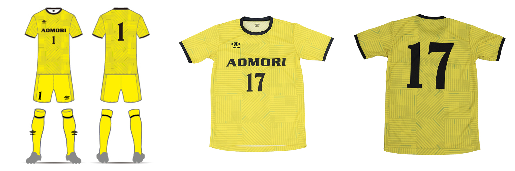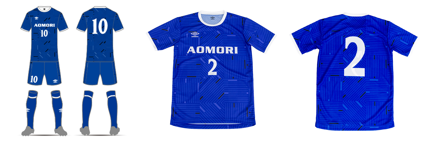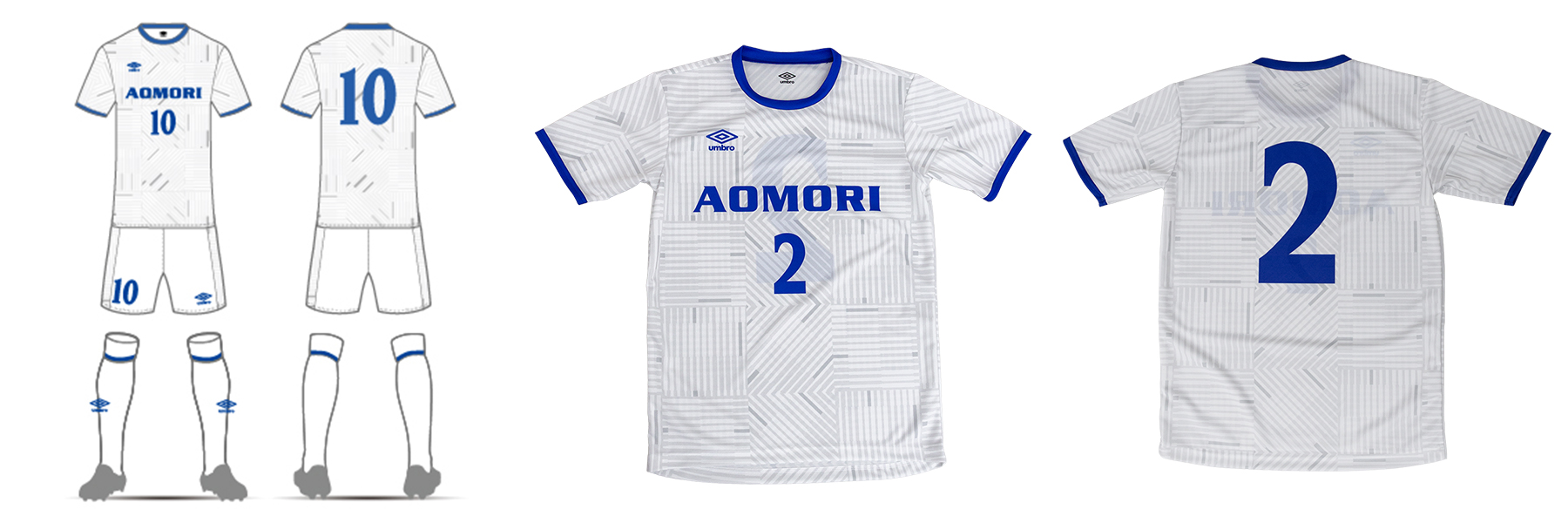 青森の伝統工芸の一つである「南部裂織(なんぶさきおり)」をモチーフに、青森県の伝統とアンブロのオリジナリティが融合した特別なデザインです。フィールドプレーヤーのユニフォームは、青森の澄んだ空と海をイメージしたブルーを基調とし、クリーンなデザインに仕上げています。